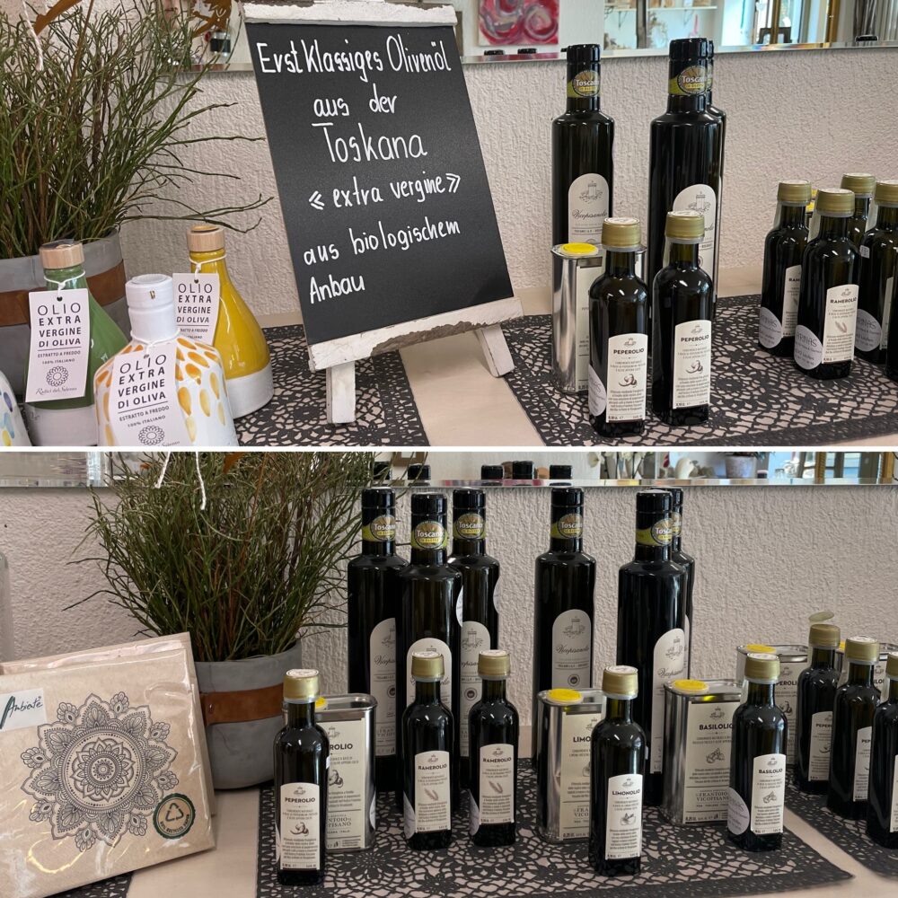 Olivenöl aus der Toscana. Natur,Knoblauch,Zitrone,Peproncini und Basilikum geben sich die Ehre.