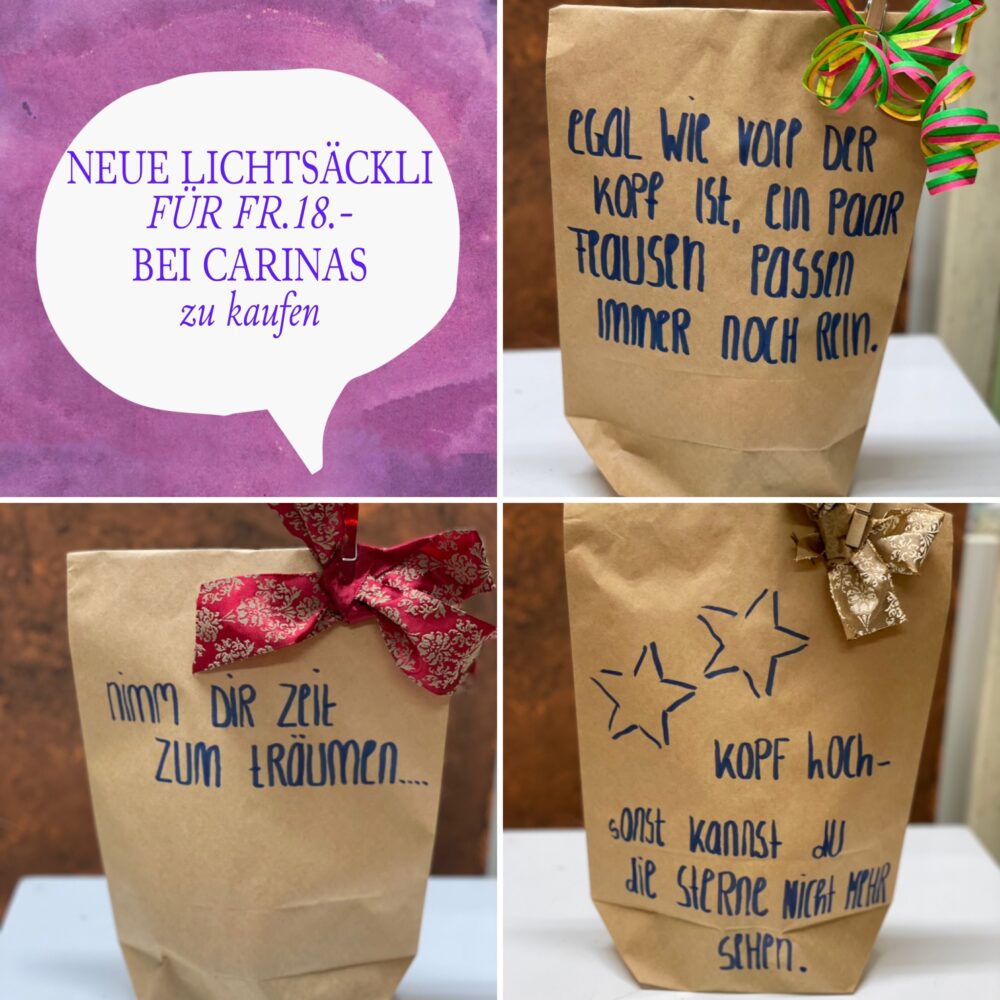 Lichtsäckli gefüllt mit 1 Duftkerze 10. Dezember 2021 by Carinas Kommentar verfassen Wir schreiben auch sehr gerne eigene Texte für unsere Kunden. Auch können die Lichtsäckli individuell gefüllt werden. Fragen Sie uns einfach an.